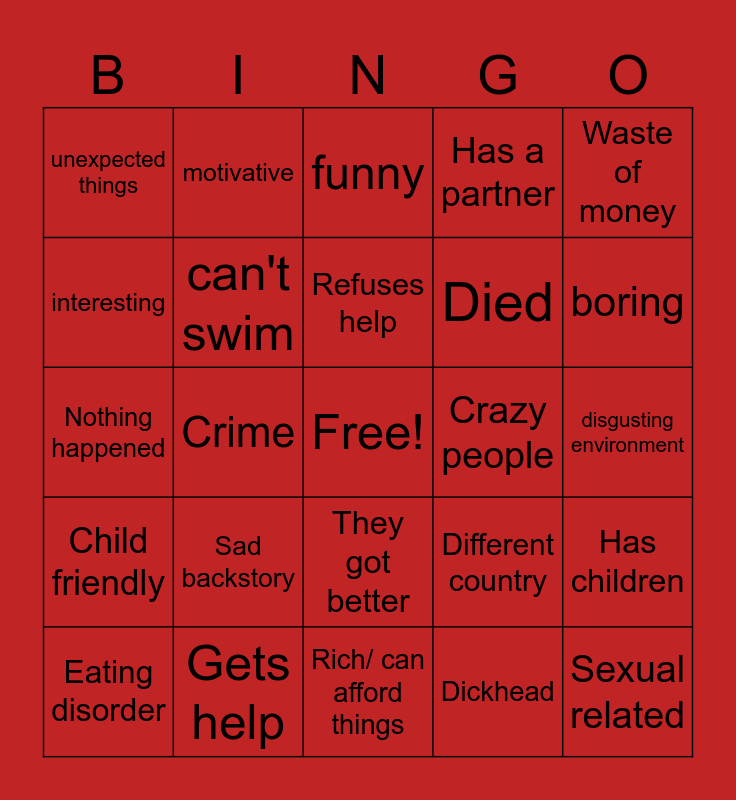 This bingo card has a free space and 24 words: Sad backstory, Gets help, Refuses help, Eating disorder, Waste of money, unexpected things, interesting, motivative, Crazy people, They got better, Died, Nothing happened, Different country, Has children, can't swim, Dickhead, disgusting environment, funny, boring, Crime, Sexual related, Child friendly, Has a partner and Rich/ can afford things.