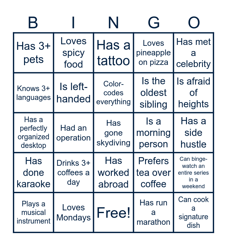 This bingo card has 31 words: Free!, Is afraid of clowns, Had an operation, Loves plants, Has 3+ pets, Has a tattoo, Is left-handed, Prefers tea over coffee, Is a morning person, Has run a marathon, Has a side hustle, Has gone skydiving, Can cook a signature dish, Has a hidden talent, Is afraid of heights, Loves horror movies, Can binge-watch an entire series in a weekend, Drinks 3+ coffees a day, Has done karaoke, Has worked abroad, Has met a celebrity, Has traveled solo, Plays a musical instrument, Loves spicy food, Is the oldest sibling, Knows 3+ languages, Loves pineapple on pizza, Has a perfectly organized desktop, Loves Mondays, Color-codes everything and Loves keyboard shortcuts.