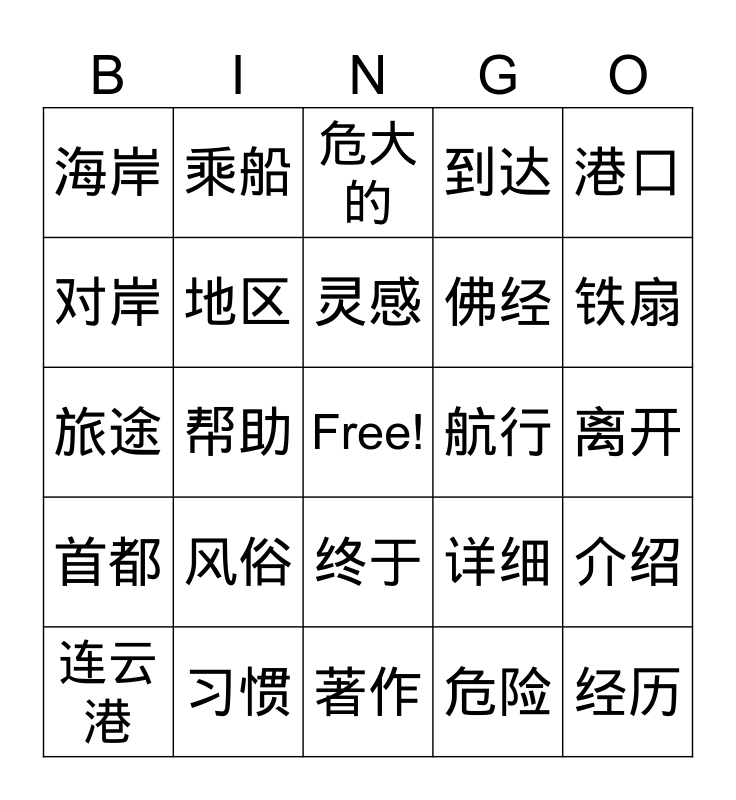 This bingo card has a free space and 24 words: 风俗, 习惯, 灵感, 连云港, 港口, 海岸, 对岸, 乘船, 航行, 终于, 佛经, 旅途, 详细, 介绍, 地区, 危险, 离开, 危大的, 铁扇, 帮助, 经历, 首都, 到达 and 著作.