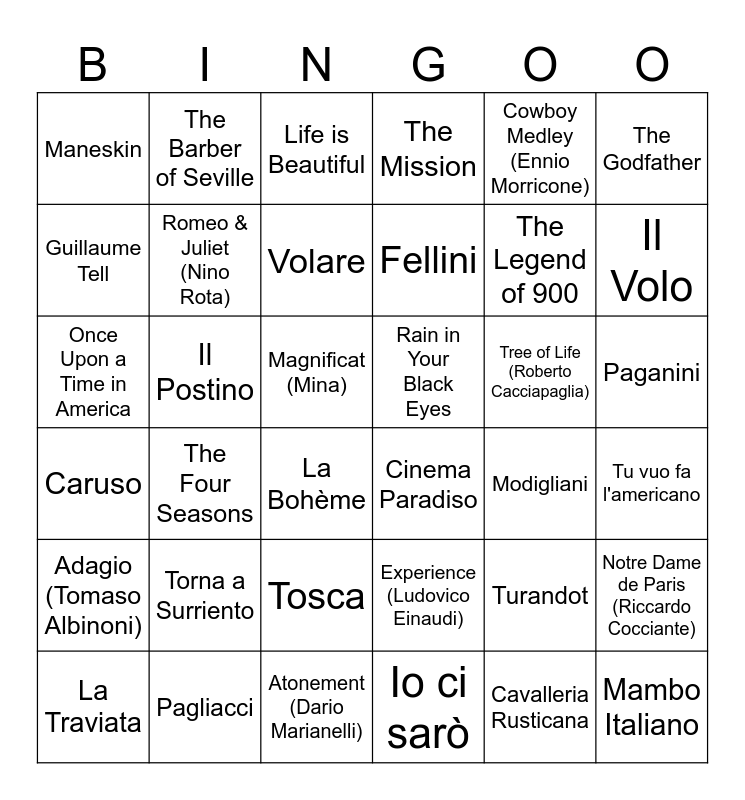 This bingo card has 36 words: Experience (Ludovico Einaudi), Tosca, Io ci sarò, Guillaume Tell, Caruso, Rain in Your Black Eyes, Romeo & Juliet (Nino Rota), Atonement (Dario Marianelli), Cowboy Medley (Ennio Morricone), Turandot, Il Volo, The Mission, Notre Dame de Paris (Riccardo Cocciante), Il Postino, Fellini, Maneskin, Adagio (Tomaso Albinoni), Tree of Life (Roberto Cacciapaglia), Once Upon a Time in America, Life is Beautiful, Magnificat (Mina), The Four Seasons, Cinema Paradiso, La Bohème, Modigliani, The Barber of Seville, The Legend of 900, Pagliacci, Volare, The Godfather, Mambo Italiano, La Traviata, Tu vuo fa l'americano, Paganini, Torna a Surriento and Cavalleria Rusticana.