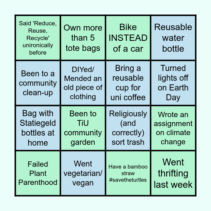 This bingo card has 16 words: Failed Plant Parenthood, Went vegetarian/ vegan, Bike INSTEAD of a car, Reusable water bottle, Been to a community clean-up, Own more than 5 tote bags, Religiously (and correctly) sort trash, Wrote an assignment on climate change, Said 'Reduce, Reuse, Recycle' unironically before, DIYed/ Mended an old piece of clothing, Have a bamboo straw #savetheturtles, Turned lights off on Earth Day, Bag with Statiegeld bottles at home, Been to TiU community garden, Bring a reusable cup for uni coffee and Went thrifting last week.