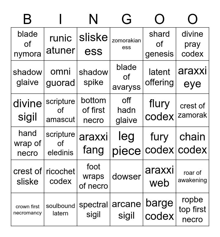 This bingo card has 39 words: soulbound latern, crown first necromancy, ode to deceit, shadow glaive, araxxi fang, crest of zamorak, omni guorad, ropbe top first necro, shard of genesis, off hadn glaive, araxxi eye, zomorakian ess, divine sigil, bottom of first necro, scripture of amascut, flury codex, araxxi web, blade of nymora, spectral sigil, hand wrap of necro, divine pray codex, fury codex, shadow spike, blade of avaryss, arcane sigil, foot wraps of necro, crest of sliske, barge codex, ricochet codex, runic atuner, elysian sigil, roar of awakening, sliske ess, leg piece, chain codex, dowser, scripture of eledinis, latent offering and eclipsed soul codex.