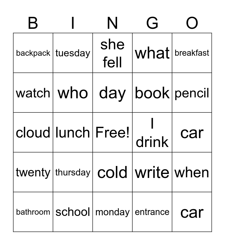 This bingo card has a free space and 48 words: plant, car, wednesday, monday, thursday, friday, tuesday, two, watch, seconds, who, what, when, write, speak, name, day, I drink, bus, breakfast, lunch, entrance, backpack, book, paper, pencil, bathroom, dog, cold, twenty, dinner, we eat, clothes, help, school, apple, countries, car, chair, table, door, decide, she fell, dress, cloud, room, bed and broom.
