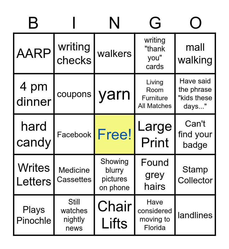 This bingo card has a free space and 76 words: Owns more than 2 cats, canes, walkers, complaining about the room being too hot, complaining about the room being too cold, complaining, Comfortable Shoes, "what's an HDMI?", Waking up at 4 am, long rambling stories, prunes, knitting, yarn, 4 pm dinner, newspapers, Facebook, playing bingo, landlines, naps, mall walking, knowing what a cursive z looks like, hard candy, coupons, writing checks, writing "thank you" cards, nightgowns, complaining about being old, Uses Senior Discounts, reading glasses, Worried about the Economy, Concerned about fiber, Get annoyed about remakes of movies, one glass of wine gets you drunk, Found grey hairs, Have said the phrase "kids these days...", Living Room Furniture All Matches, Fan of Historical Dramas, Can't find your keys, Can't find your badge, Have considered moving to Florida, Excited about farmers markets, Don't recognize any popular music, Enjoys Jazz, Gardens, Feel Stiff for no reason, Plays Bridge, Plays Pinochle, AARP, Has said "don't get old", hearing aids, Answering the phone "yello", Showing blurry pictures on phone, "If I were younger...", arrives to event an hour before it starts, Falls asleep in public place, Never misses happy hour, Participates in Treasure Sale, Attending any event with free food, Magazine subscriptions, Still uses cable, Medicine Cassettes, Loves to Dance, Gets a regular Shampoo and Set, Puzzles, Shuttles to activities, Cruises, Large Print, Medicare, Social Security, Coin Collector, Stamp Collector, Writes Letters, Still watches nightly news, Uses age as an excuse for younger to do something, Chair Lifts and Busier now in retirement then when working.