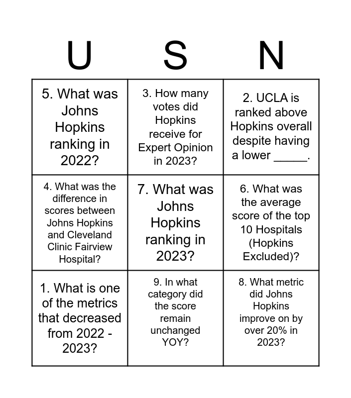 This bingo card has 9 words: 1. What is one of the metrics that decreased from 2022 - 2023?, 2. UCLA is ranked above Hopkins overall despite having a lower _____., 3. How many votes did Hopkins receive for Expert Opinion in 2023?, 4. What was the difference in scores between Johns Hopkins and Cleveland Clinic Fairview Hospital?, 5. What was Johns Hopkins ranking in 2022?, 6. What was the average score of the top 10 Hospitals (Hopkins Excluded)?, 7. What was Johns Hopkins ranking in 2023?, 8. What metric did Johns Hopkins improve on by over 20% in 2023? and 9. In what category did the score remain unchanged YOY?.