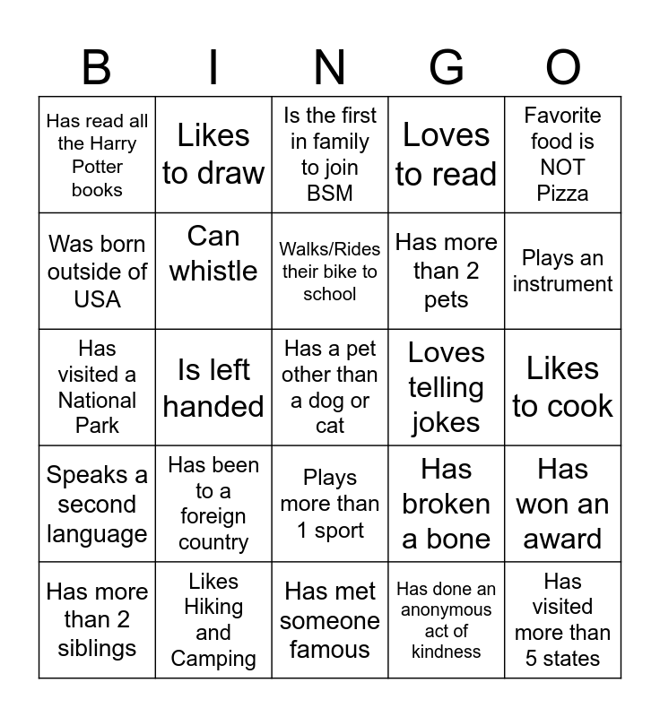 This bingo card has a free space and 24 words: Has been to a foreign country, Likes Hiking and Camping, Walks/Rides their bike to school, Has more than 2 siblings, Favorite food is NOT Pizza, Has read all the Harry Potter books, Was born outside of USA, Likes to draw, Loves telling jokes, Plays more than 1 sport, Has more than 2 pets, Has visited a National Park, Has broken a bone, Has won an award, Can whistle, Has done an anonymous act of kindness, Likes to cook, Is the first in family to join BSM, Plays an instrument, Is left handed, Has visited more than 5 states, Speaks a second language, Loves to read and Has met someone famous.