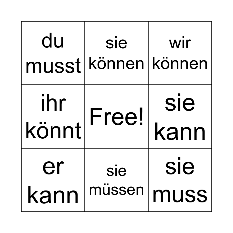 This bingo card has a free space and 16 words: er muss, ich kann, wir können, du musst, ihr müsst, sie können, ich muss, du kannst, sie muss, sie kann, wir müssen, ihr könnt, es muss, sie müssen, er kann and es kann.