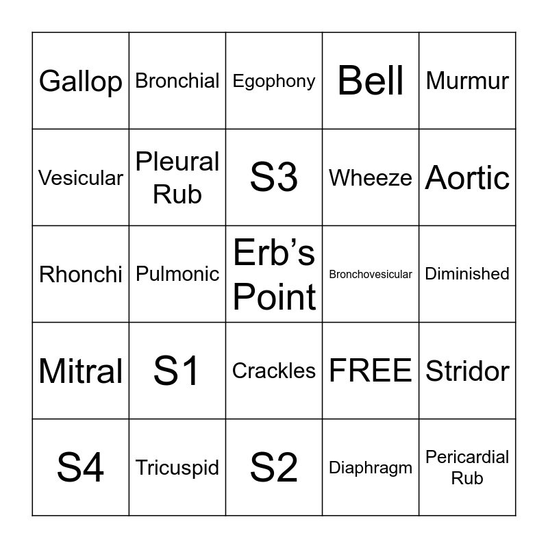 This bingo card has 25 words: S1, S2, S3, S4, Murmur, Gallop, Vesicular, Bronchial, Bronchovesicular, Crackles, Wheeze, Rhonchi, FREE, Stridor, Pleural Rub, Pericardial Rub, Diminished, Egophony, Aortic, Pulmonic, Erb’s Point, Tricuspid, Mitral, Bell and Diaphragm.
