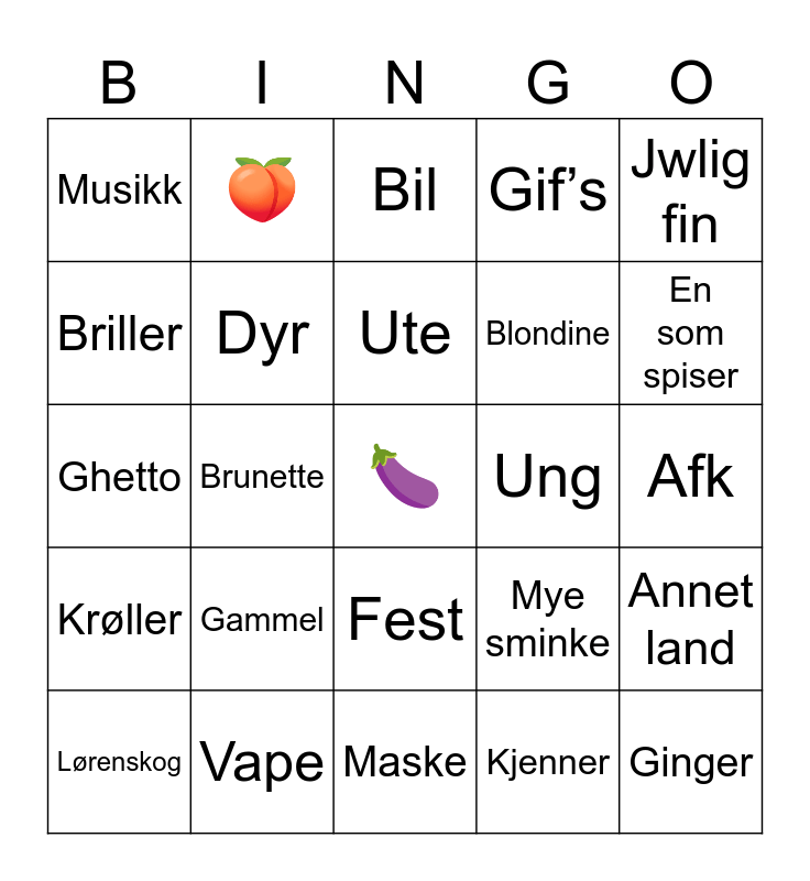 This bingo card has a free space and 24 words: Lørenskog, Gammel, Ute, Kjenner, Jwlig fin, Musikk, 🍑, Bil, Ung, Afk, Ghetto, Dyr, Mye sminke, Annet land, Briller, Vape, Maske, Gif’s, En som spiser, Krøller, Brunette, Fest, Blondine and Ginger.