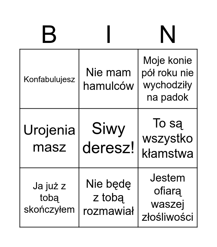 This bingo card has a free space and 8 words: To są wszystko kłamstwa, Moje konie pół roku nie wychodziły na padok, Nie mam hamulców, Ja już z tobą skończyłem, Konfabulujesz, Jestem ofiarą waszej złośliwości, Urojenia masz and Nie będę z tobą rozmawiał.