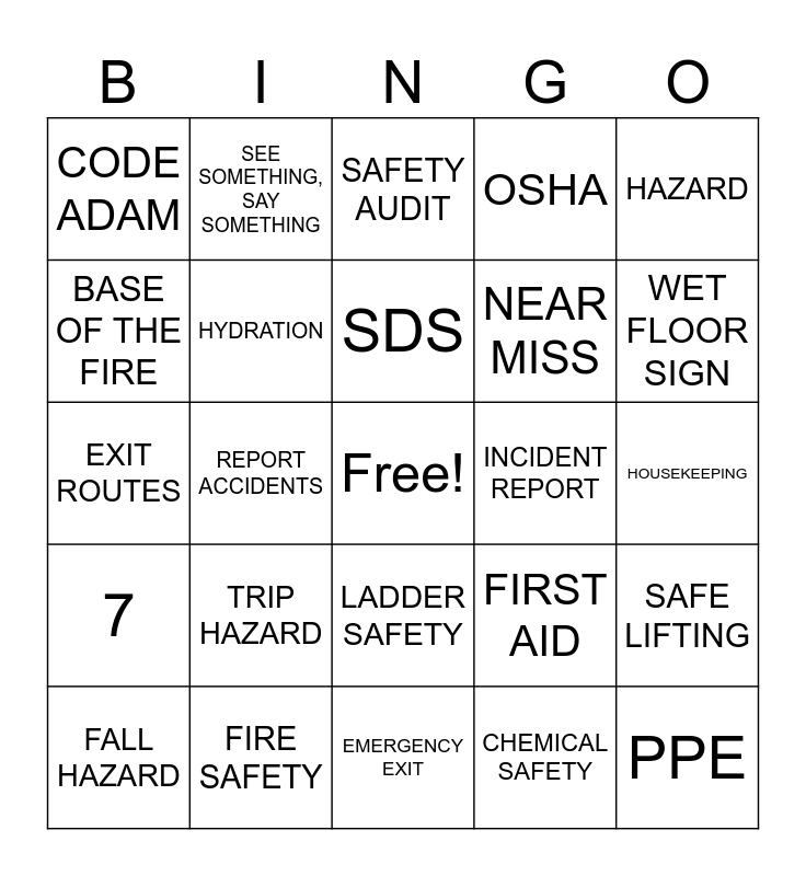 This bingo card has a free space and 29 words: FALL HAZARD, 15, REPORT ACCIDENTS, SAFETY FIRST, CODE ADAM, SAFETY AUDIT, HYDRATION, TRIP HAZARD, INCIDENT REPORT, FIRE SAFETY, HOUSEKEEPING, PPE, EMERGENCY EXIT, CHEMICAL SAFETY, WET FLOOR SIGN, 36 INCHES, LADDER SAFETY, 7, HAZARD, EXIT ROUTES, FIRST AID, EYE WASH STATION, NEAR MISS, BASE OF THE FIRE, OSHA, SEE SOMETHING, SAY SOMETHING, SAFE LIFTING, SDS and FIRE EXTINGUISHER.