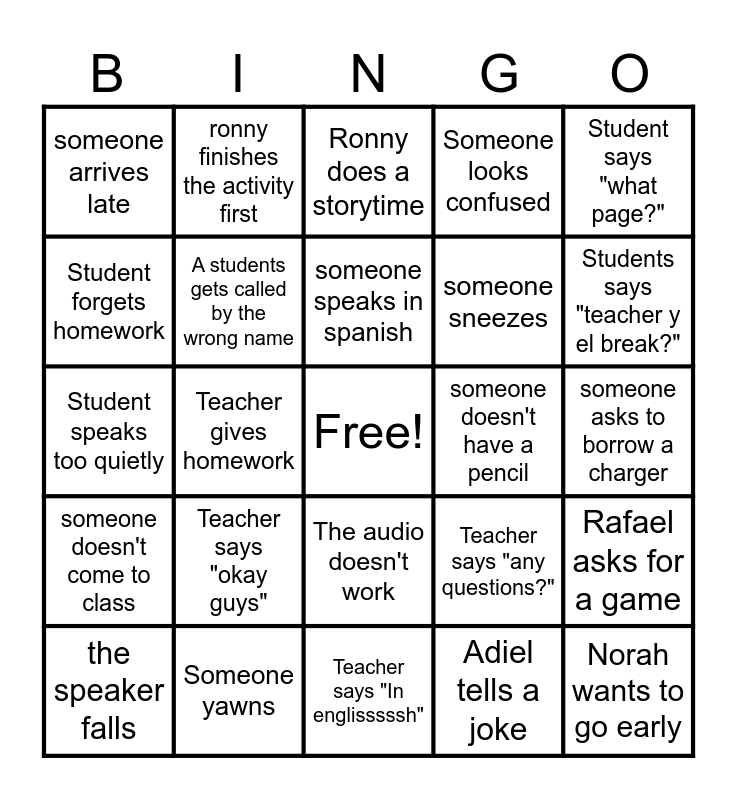 This bingo card has a free space and 24 words: Teacher says "okay guys", Someone yawns, someone speaks in spanish, the speaker falls, Student says "what page?", someone arrives late, Student forgets homework, ronny finishes the activity first, someone doesn't have a pencil, The audio doesn't work, someone sneezes, Student speaks too quietly, Teacher says "any questions?", Rafael asks for a game, A students gets called by the wrong name, Adiel tells a joke, someone asks to borrow a charger, Ronny does a storytime, Students says "teacher y el break?", Teacher gives homework, Norah wants to go early, someone doesn't come to class, Someone looks confused and Teacher says "In englisssssh".