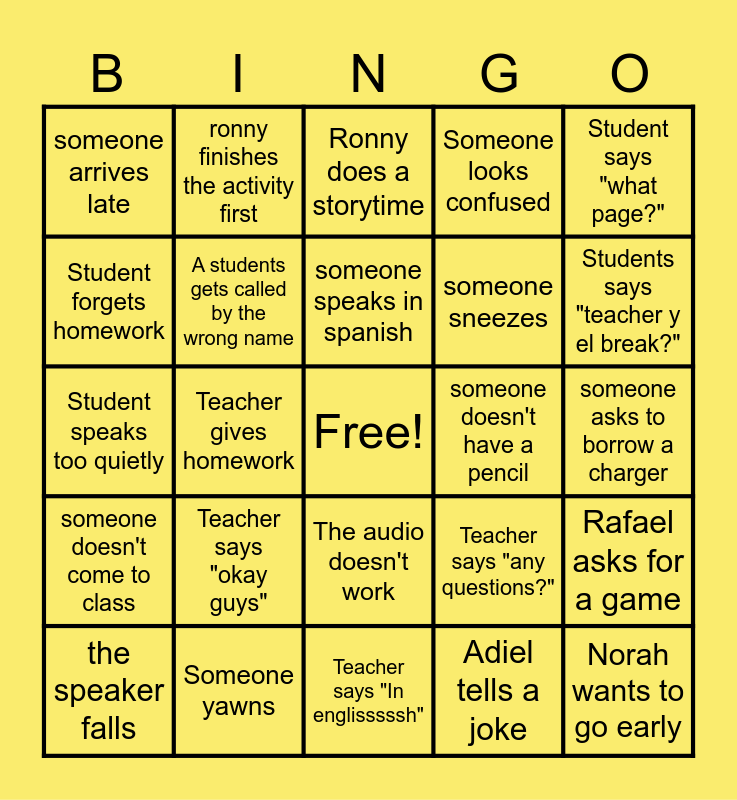 This bingo card has a free space and 24 words: Teacher says "okay guys", Someone yawns, someone speaks in spanish, the speaker falls, Student says "what page?", someone arrives late, Student forgets homework, ronny finishes the activity first, someone doesn't have a pencil, The audio doesn't work, someone sneezes, Student speaks too quietly, Teacher says "any questions?", Rafael asks for a game, A students gets called by the wrong name, Adiel tells a joke, someone asks to borrow a charger, Ronny does a storytime, Students says "teacher y el break?", Teacher gives homework, Norah wants to go early, someone doesn't come to class, Someone looks confused and Teacher says "In englisssssh".