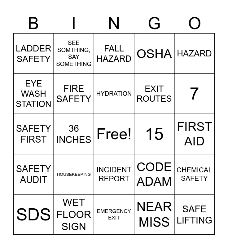 This bingo card has a free space and 29 words: SDS, FIRE EXTINGUISHER, 36 INCHES, PPE, LADDER SAFETY, FALL HAZARD, FIRE SAFETY, HOUSEKEEPING, 15, WET FLOOR SIGN, FIRST AID, SAFE LIFTING, EMERGENCY EXIT, NEAR MISS, 7, BASE OF THE FIRE, INCIDENT REPORT, SAFETY AUDIT, HAZARD, SAFETY FIRST, CODE ADAM, REPORT ACCIDENTS, EXIT ROUTES, EYE WASH STATION, OSHA, SEE SOMTHING, SAY SOMETHING, CHEMICAL SAFETY, HYDRATION and TRIP HAZARD.