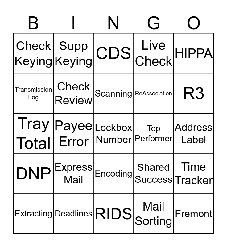 This bingo card has 39 words: Free!, Deposit Cut, Work Unit, Check Review, Extracting, Encoding, Scanning, Data Entry, HIPPA, DNP, Payee Error, Live Check, Lockbox Number, Address Label, Top Performer, Express Mail, Foreign Item, Check Keying, Gold Coin, Shared Success, Transmission Log, RIDS, ReAssociation, R3, Yellow Work, Green Work, Fremont, Productivity, Credit Cards, Supp Keying, Retail Work, Virtual Box, CDS, Deadlines, Mail Sorting, Q12, Time Tracker, Tray Total and TID.