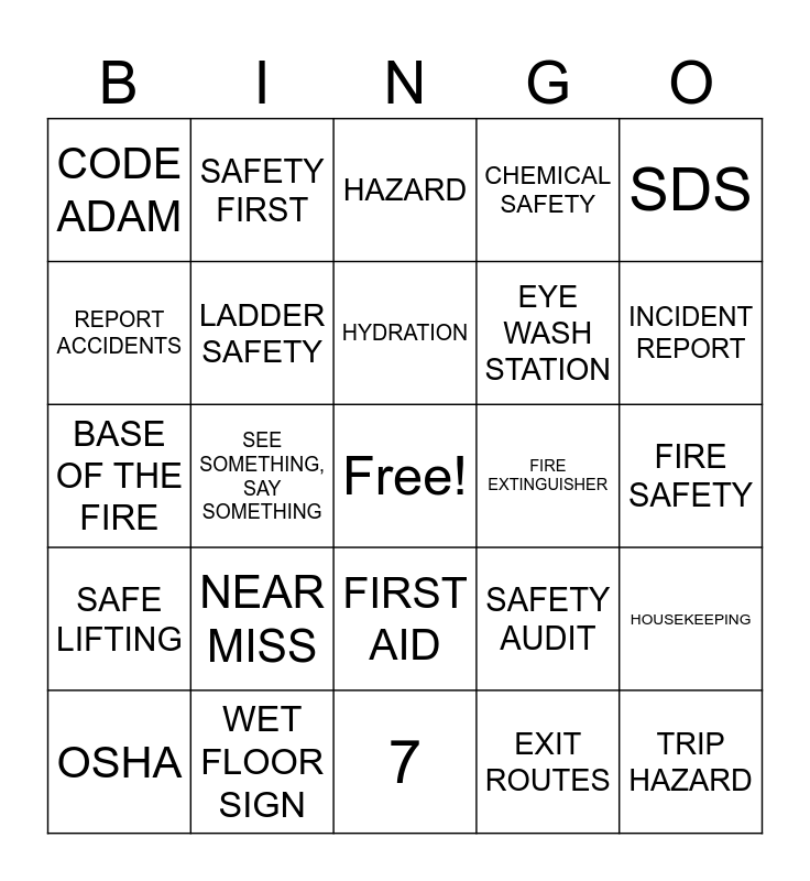 This bingo card has a free space and 29 words: OSHA, 15, SEE SOMETHING, SAY SOMETHING, 36 INCHES, CODE ADAM, HAZARD, LADDER SAFETY, NEAR MISS, FIRE EXTINGUISHER, WET FLOOR SIGN, FIRE SAFETY, TRIP HAZARD, 7, EXIT ROUTES, INCIDENT REPORT, PPE, FIRST AID, SAFE LIFTING, SDS, BASE OF THE FIRE, SAFETY AUDIT, EMERGENCY EXIT, EYE WASH STATION, REPORT ACCIDENTS, CHEMICAL SAFETY, SAFETY FIRST, HOUSEKEEPING, HYDRATION and FALL HAZARD.