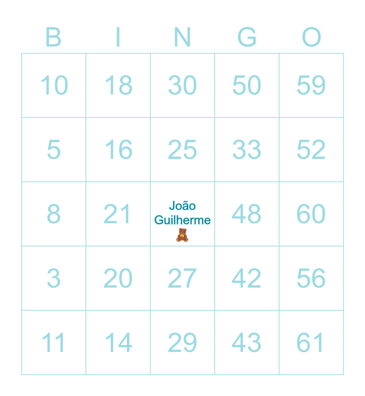 This bingo card has a free space and 24 words: 11, 20, 25, 43, 59, 10, 18, 30, 48, 60, 8, 16, 42, 56, 5, 14, 29, 50, 52, 3, 21, 27, 33 and 61.