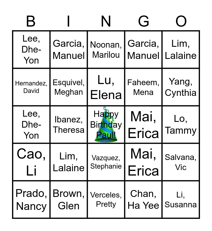 ⚠ This card has duplicate items: Al Amine, Malak (2), Brown, Glen (2), Bryan, Cheryl (2), Cao, Li (2), Chan, Ha Yee (2), De Castro, Claire (2), Esquivel, Meghan (2), Evangelista, Lolita (2), Faheem, Mena (2), Fung, Becky (2), Garcia, Manuel (2), Hanna, Wael (2), Hernandez, David (2), Ibanez, Theresa (2), Laureano, Catherine (2), Lee, Dhe-Yon (2), Li, Susanna (2), Lim, Lalaine (2), Lo, Tammy (2), Lu, Elena (2), Mai, Erica (2), Noonan, Marilou (2), Prado, Nancy (2), Salvana, Vic (2), Thomas, Donald (2), Vazquez, Stephanie (2), Verceles, Pretty (2), Wikenwerder, Seth (2), Yang, Cynthia (2), Yang, Pao Ying (2)