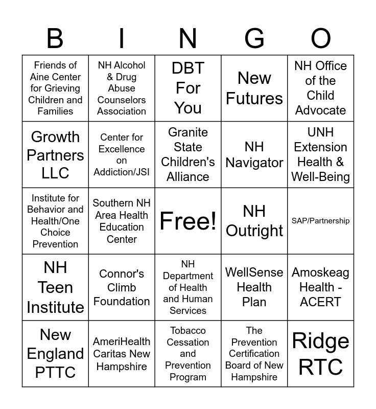 This bingo card has a free space and 27 words: WellSense Health Plan, YouthWell, NH Navigator, Tobacco Cessation and Prevention Program, Growth Partners LLC, DBT For You, NH Alcohol & Drug Abuse Counselors Association, NH Teen Institute, NH Outright, Amoskeag Health - ACERT, Institute for Behavior and Health/One Choice Prevention, New Futures, New England PTTC, AmeriHealth Caritas New Hampshire, UNH Extension Health & Well-Being, The Mental Health Center of Greater Manchester, Center for Excellence on Addiction/JSI, Granite State Children's Alliance, Connor's Climb Foundation, Friends of Aine Center for Grieving Children and Families, SAP/Partnership, The Prevention Certification Board of New Hampshire, Southern NH Area Health Education Center, Ridge RTC, NH Department of Health and Human Services, NH Office of the Child Advocate and Charlie Health.