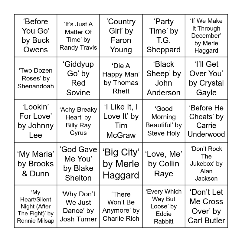 This bingo card has 25 words: ‘God Gave Me You’ by Blake Shelton, ‘There Won’t Be Anymore’ by Charlie Rich, ‘Die A Happy Man’ by Thomas Rhett, ‘My Heart/Silent Night (After The Fight)’ by Ronnie Milsap, ‘If We Make It Through December’ by Merle Haggard, ‘Before You Go’ by Buck Owens, ‘Two Dozen Roses’ by Shenandoah, ‘It’s Just A Matter Of Time’ by Randy Travis, ‘Good Morning Beautiful’ by Steve Holy, ‘Big City’ by Merle Haggard, ‘Black Sheep’ by John Anderson, ‘Lookin’ For Love’ by Johnny Lee, ‘Love, Me’ by Collin Raye, ‘Don’t Rock The Jukebox’ by Alan Jackson, ‘Giddyup Go’ by Red Sovine, ‘Don’t Let Me Cross Over’ by Carl Butler, ‘Before He Cheats’ by Carrie Underwood, ‘Country Girl’ by Faron Young, ‘I’ll Get Over You’ by Crystal Gayle, ‘Achy Breaky Heart’ by Billy Ray Cyrus, ‘I Like It, I Love It’ by Tim McGraw, ‘Why Don’t We Just Dance’ by Josh Turner, ‘My Maria’ by Brooks & Dunn, ‘Party Time’ by T.G. Sheppard and ‘Every Which Way But Loose’ by Eddie Rabbitt.