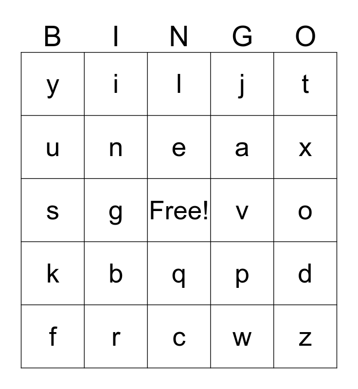 This bingo card has a free space and 26 words: q, w, e, r, t, y, u, i, o, p, a, s, d, f, g, h, j, k, l, z, x, c, v, b, n and m.