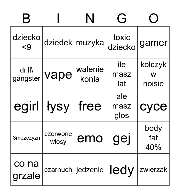 This bingo card has 25 words: czerwone włosy, jedzenie, walenie konia, co na grzale, gamer, dziecko <9, drill\ gangster, dziedek, ale masz glos, emo, ile masz lat, egirl, gej, body fat 40%, vape, zwierzak, cyce, muzyka, kolczyk w noisie, łysy, free, czarnuch, 3mezczyzn, toxic dziecko and ledy.