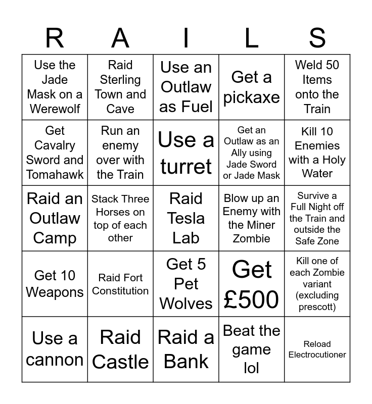 This bingo card has 30 words: Raid Castle, Kill 5 Enemies with a Molotov, Stack Three Horses on top of each other, Get Tumbleweed, Use the Jade Mask on a Werewolf, Use an Outlaw as Fuel, Run an enemy over with the Train, Get 5 Pet Wolves, Blow up an Enemy with the Miner Zombie, Raid a Bank, Survive a Full Night off the Train and outside the Safe Zone, Raid Tesla Lab, Beat the game lol, Reload Electrocutioner, Kill 10 Enemies with a Holy Water, Use the Jade Mask on Captain Prescott, Get £500, Get 10 Weapons, Raid Fort Constitution, Weld 50 Items onto the Train, Raid an Outlaw Camp, Buy a Saddle, Raid Sterling Town and Cave, Get an Outlaw as an Ally using Jade Sword or Jade Mask, Get Cavalry Sword and Tomahawk, Get a pickaxe, Kill one of each Zombie variant (excluding prescott), Use a cannon, Use a turret and Kill zombie with electrocutioner.
