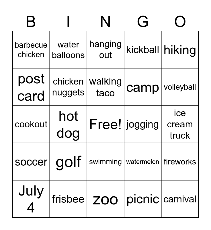 This bingo card has a free space and 46 words: doritos, carnival, ice cream, zoo, golf, baseball, water balloons, concerts, post card, travel, chicken nuggets, kickball, fireworks, watermelon, popsicle, boating, walking taco, jogging, souvenir, hiking, hot dog, picnic, barbecue chicken, camp, bike riding, volleyball, July 4, ocean, swimming, soccer, fried oreos, walk, vacation, potato chips, sand, frisbee, ice cream truck, summer, hamburgers, amusement park, gardening, hanging out, cookout, beach, corn dog and parades.