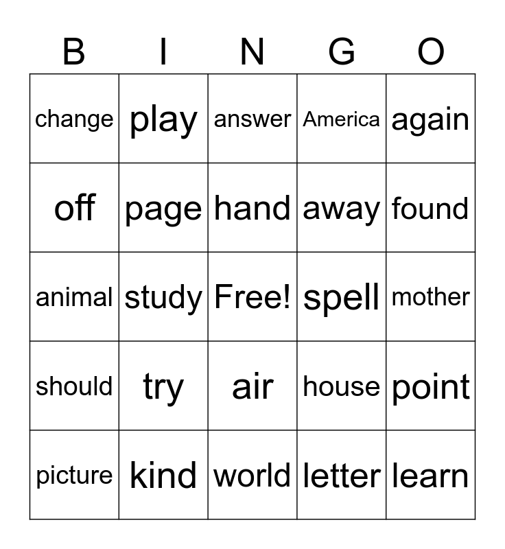 This bingo card has a free space and 24 words: try, kind, hand, picture, again, change, off, play, spell, air, away, animal, house, point, page, letter, mother, answer, found, study, learn, should, America and world.