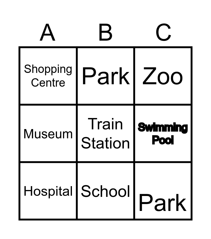 This bingo card has a free space and 8 words: Swimming Pool, Zoo, Park, Hospital, Shopping Centre, Park, Museum and School.
