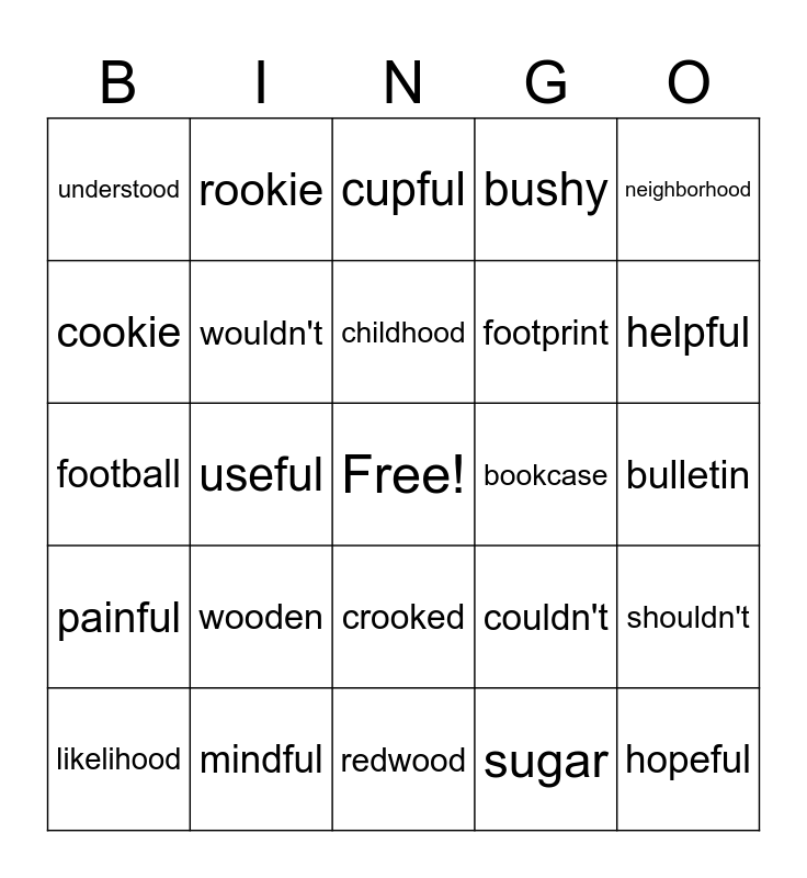 This bingo card has a free space and 25 words: wooden, redwood, childhood, likelihood, neighborhood, understood, cookie, rookie, bookcase, crooked, footprint, football, couldn't, shouldn't, wouldn't, bullfrog, bulletin, cupful, helpful, useful, hopeful, mindful, painful, bushy and sugar.