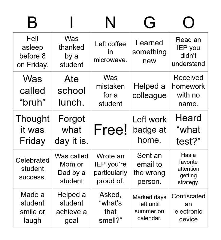 This bingo card has a free space and 31 words: Asked, “what’s that smell?”, Was called “teacher”, Forgot what day it is., Got locked out of the building, Fell asleep before 8 on Friday., Left coffee in microwave., Ate school lunch., Sent an email to the wrong person., Left work badge at home., Marked days left until summer on calendar., Heard “what test?”, Confiscated an electronic device, Took a day for yourself, Spent a period “winging it”, Received homework with no name., Said “We don’t do that at school”, Has a favorite attention getting strategy., Was called Mom or Dad by a student, Celebrated student success., Wrote an IEP you’re particularly proud of., Read an IEP you didn’t understand, Helped a student have an ‘a-ha moment’, Made a student smile or laugh, Was thanked by a student, Helped a colleague, Was called “bruh”, Learned something new, Thought it was Friday, Helped a student achieve a goal, Was mistaken for a student and Planned your summer vacation.