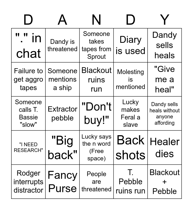 This bingo card has 45 words: Main floor five, "Don't buy!", Heal request of any sort, Rodger interrupts distractor, Distractor Dies - Everyone does, T. Pebble ruins run, Someone takes tapes from Sprout, "Worth it" after being hit, Dandy sells heals, Fancy Purse, Diary is used, Lucky makes Feral a slave, Lucky says the n word (Free space), "Big back", "Tweaking out", People are threatened, Double twisteds, Someone calls T. Bassie "slow", "Give me a bonbon", "Give me a heal", Dandy is threatened, Someone makes an offensive joke, Feral mentions her trauma, "." in chat, Heals on floor one, Dandy sells heals without anyone affording, Dandy sells dupe items, Koi fronts to tell Feral he'll touch her (oh god), Back shots, "I NEED RESEARCH", Distractor dies, Healer dies, Feral dies to not seeing something, "Calm before the storm", Someone screams "help", Extractor pebble, Extractor Goob, Feral says "UwU", Blackout + Pebble, Blackout ruins run, Failure to get aggro tapes, Molesting is mentioned, Freaky floor, Someone mentions a ship and Feral says that she's dying.