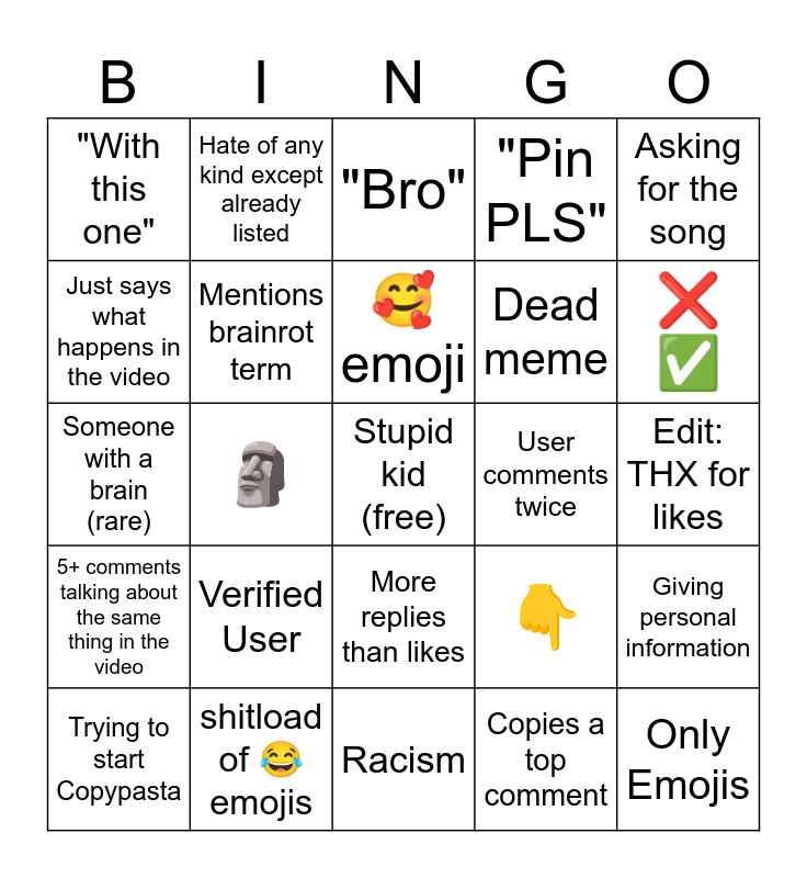 This bingo card has a free space and 31 words: Racism, Explaining the joke, πΏ, π, "With this one", "Bro", Mentions brainrot term, π, User comments twice, Copies a top comment, Edit: THX for likes, Only Emojis, Homophobia, Comment makes 0 sense, βοΈ β οΈ, Misogyny, Giving personal information, Verified User, 5+ comments talking about the same thing in the video, More replies than likes, Asking for the song, Copypasta, Trying to start Copypasta, Hate of any kind except already listed, Dead meme, Just says what happens in the video, "Pin PLS", Someone with a brain (rare), shitload of πemojis, π₯°emoji and all emojis.