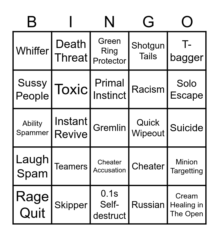 This bingo card has a free space and 34 words: 200+ Danger Time, Russian, Cream Targetting, Tails Targetting, Laugh Spam, Toxic, T-bagger, Rage Quit, Death Threat, Mr Mars, Primal Instinct, Green Ring Protector, M1 EXE, Sweat, Quick Wipeout, Solo Escape, Skipper, Ability Spammer, Teamers, Cheater, Cheater Accusation, Revenge Seeker, Whiffer, Suicide, 0.1s Self-destruct, Cream Healing in The Open, Shotgun Tails, Survivor Saw Blade Hit, Racism, Sussy People, Shadow Jockey, Instant Revive, Minion Targetting and AFK Midround.