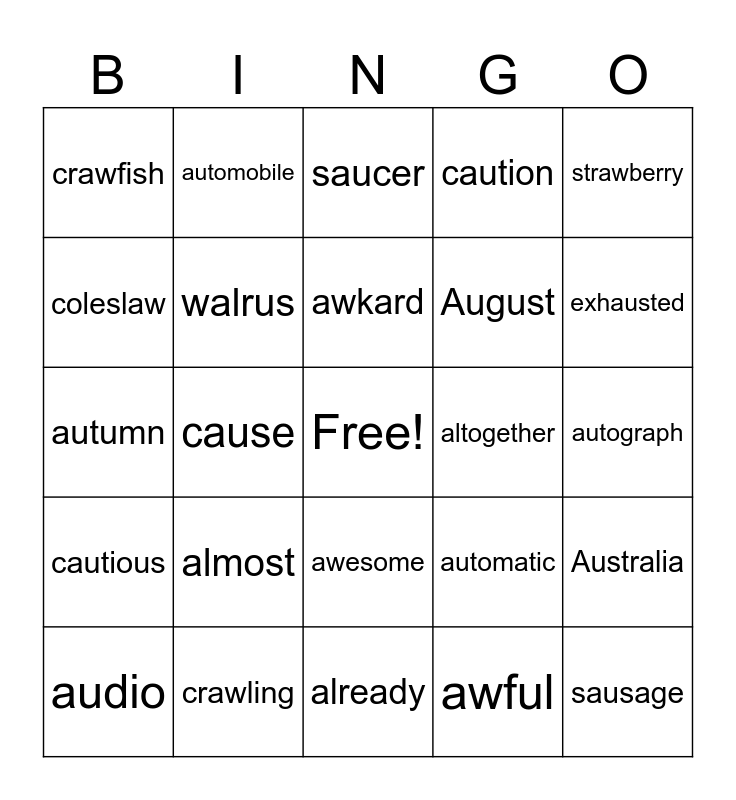 This bingo card has a free space and 26 words: awesome, awful, awkard, crawling, strawberry, crawfish, coleslaw, automobile, autograph, automatic, August, autumn, Australia, audio, cause, because, caution, cautious, saucer, sausage, exhausted, already, altogether, almost, walrus and walnut.