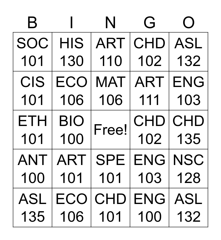 This bingo card has a free space and 41 words: ANT 100, ART 101, ART 110, ART 111, ASL 132, ASL 135, BIO 100, CHD 101, CHD 102, CHD 135, CIS 101, ECO 106, ENG 100, ENG 103, ETH 101, ANT 100, ART 101, ART 110, ART 111, ASL 132, ASL 135, BIO 100, CHD 101, CHD 102, CHD 135, CIS 101, ECO 106, ENG 100, ENG 103, ETH 101, GES 115, HIS 130, MAT 106, MAT 110, NSC 128, SOC 101, SPA 101, SPE 101, SPE 102, WEL 120 and WEL 121.