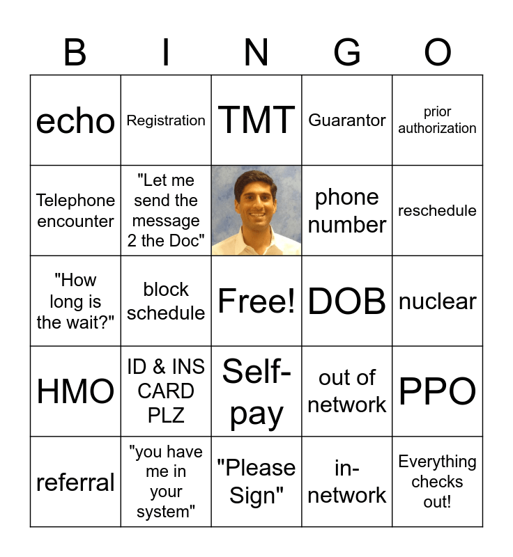 This bingo card has 1 images, a free space and 23 words: ID & INS CARD PLZ, "you have me in your system", referral, prior authorization, echo, Telephone encounter, Registration, DOB, Self-pay, phone number, "How long is the wait?", out of network, PPO, "Let me send the message 2 the Doc", in-network, nuclear, TMT, reschedule, block schedule, Everything checks out!, HMO, Guarantor and "Please Sign".