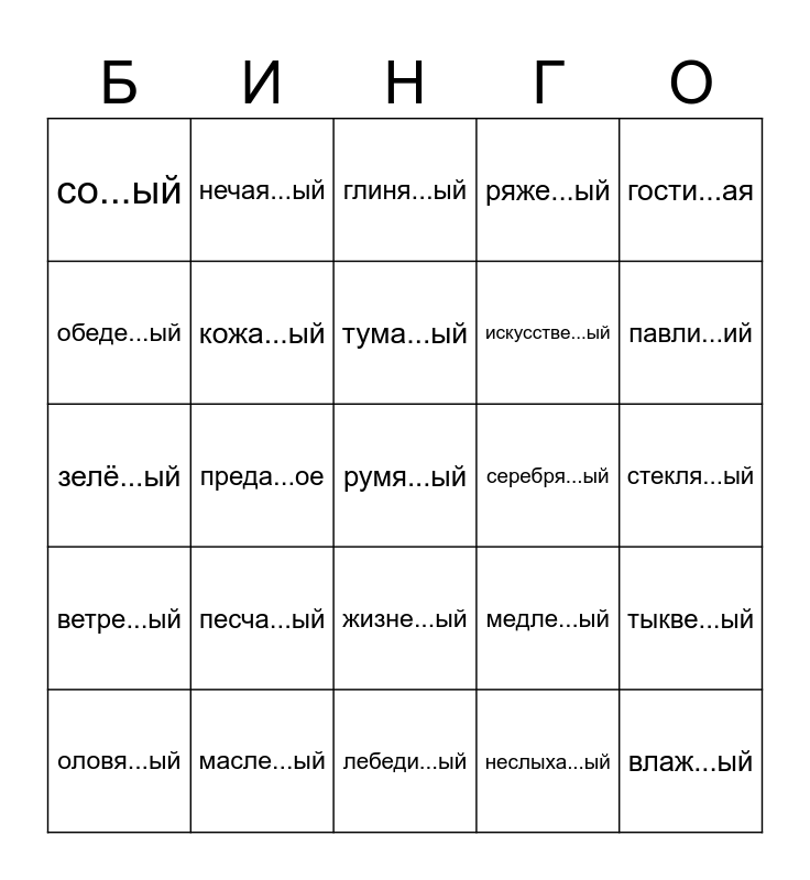 This bingo card has 25 words: песча...ый, лебеди...ый, тума...ый, оловя...ый, гости...ая, со...ый, обеде...ый, нечая...ый, серебря...ый, жизне...ый, искусстве...ый, зелё...ый, медле...ый, тыкве...ый, кожа...ый, влаж...ый, стекля...ый, глиня...ый, павли...ий, преда...ое, румя...ый, масле...ый, ветре...ый, ряже...ый and неслыха...ый.