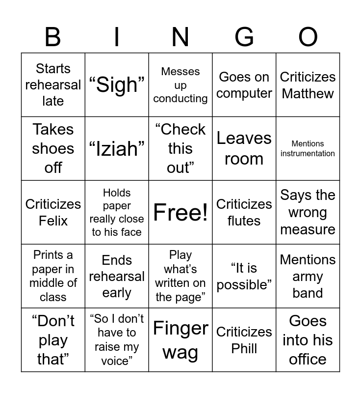 This bingo card has a free space and 24 words: Ends rehearsal early, “So I don’t have to raise my voice”, “Check this out”, “Don’t play that”, Criticizes Matthew, Starts rehearsal late, Takes shoes off, “Sigh”, Criticizes flutes, Play what’s written on the page”, Leaves room, Criticizes Felix, “It is possible”, Mentions army band, “Iziah”, Criticizes Phill, Says the wrong measure, Messes up conducting, Mentions instrumentation, Holds paper really close to his face, Goes into his office, Prints a paper in middle of class, Goes on computer and Finger wag.