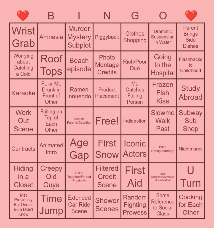 This bingo card has a free space and 48 words: First Aid, Going to the Hospital, Shower Scenes, Falling on Top of Each Other, Ramen Innuendo, Subway Sub Shop, Amnesia, Time Jump, Dramatic Suspension in Water, First Snow, Parent Brings Side Dishes, Piggyback, Frozen Fish Kiss, ML Catches Falling Person, Hiding in a Closet, Slowmo Walk Past, Worrying about Catching a Cold, Flashbacks to Childhood, Bus accident/Attempted Bus Accident, Clothes Shopping, Rich/Poor Duo, Asshole Parents/Guardian, Wrist Grab, Roof Tops, U Turn, Beach episode, Study Abroad, Met Previously But One or Both Didn't Know, Product Placement, FL or ML Drunk in Front of Other, Some Reference to Social Class, Indigestion, Nightmares, Creepy Old Guys, Work Out Scene, Iconic Actors, Fake Dating/Marriage, Karaoke, Age Gap, Living Together/Forced Proximity, Contracts, Cooking for Each Other, Murder Mystery Subplot, Extended Car Ride Scene, Photo Montage Credits, Filtered Credit Scene, Animated Intro and Random Fighting Prowess.
