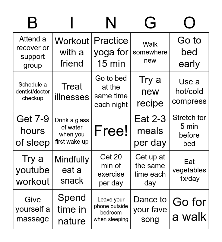 This bingo card has a free space and 29 words: Take prescribed meds, Spend time in nature, Practice yoga for 15 min, Share a meal with a friend, Go to bed early, Attend a recover or support group, Treat illnesses, Go to bed at the same time each night, Eat 2-3 meals per day, Eat vegetables 1x/day, Give yourself a massage, Drink a glass of water when you first wake up, Dance to your fave song, Go for a walk, Get 7-9 hours of sleep, Take a night off from alcohol/weed, Leave your phone outside bedroom when sleeping, Get up at the same time each day, Use a hot/cold compress, Try a youtube workout, Mindfully eat a snack, Plan a meal ahead of time, Try a new recipe, Stretch for 5 min before bed, Schedule a dentist/doctor checkup, Workout with a friend, Get 20 min of exercise per day, Walk somewhere new and Eat a high fiber snack.