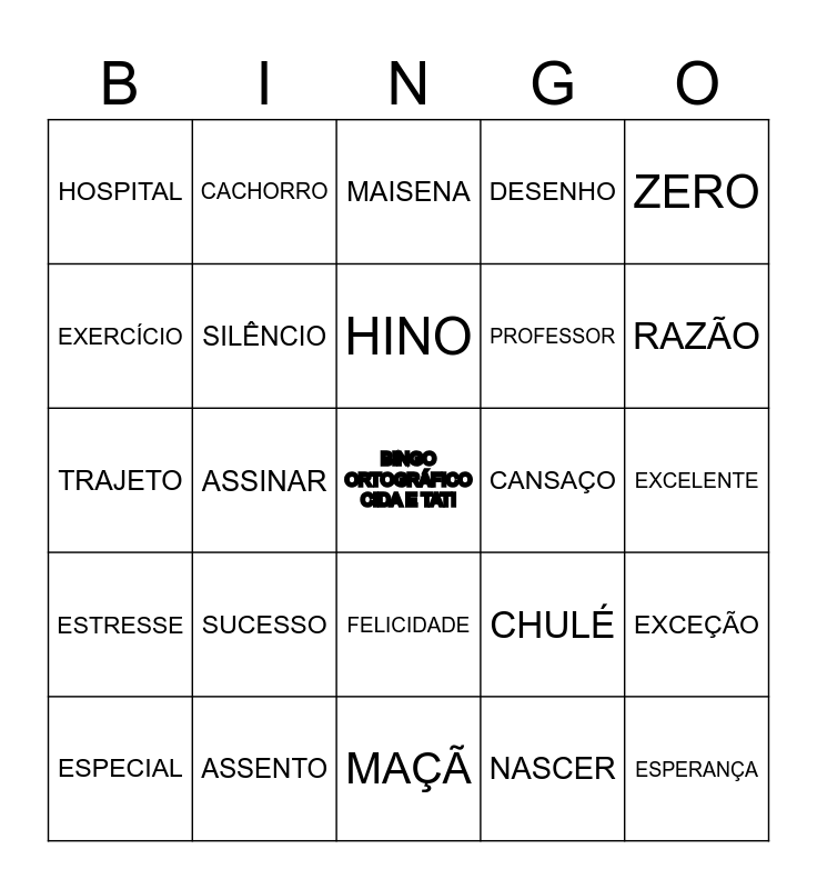 This bingo card has a free space and 49 words: CASA, ESPERANÇA, CHAVE, MAÇÃ, SUCESSO, PRAZER, CACHORRO, AÇÚCAR, EXERCÍCIO, HISTÓRIA, SILÊNCIO, DESENHO, EXCEÇÃO, CHULÉ, CORAÇÃO, SAPATO, HINO, CANSAÇO, CHAPÉU, ZERO, ASSINAR, NASCER, HOSPITAL, PROFESSOR, CHÁ, RAZÃO, ESPECIAL, CINEMA, FELICIDADE, ESTRESSE, HESITAR, ENXERGAR, CACHIMBO, HORTA, ASSENTO, PRECISAR, LAJE, XADREX, EXCELENTE, ZÍPER, XAMPU, BARRACA, SERROTE, CARACOL, TRAJETO, MAISENA, DE REPENTE, COM CERTEZA and PARALISAR.