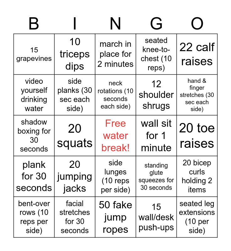 This bingo card has a free space and 24 words: 20 jumping jacks, facial stretches for 30 seconds, neck rotations (10 seconds each side), bent-over rows (10 reps per side), 22 calf raises, 15 grapevines, video yourself drinking water, 10 triceps dips, wall sit for 1 minute, side lunges (10 reps per side), 12 shoulder shrugs, shadow boxing for 30 seconds, standing glute squeezes for 30 seconds, 20 bicep curls holding 2 items, side planks (30 sec each side), 15 wall/desk push-ups, 20 toe raises, march in place for 2 minutes, hand & finger stretches (30 sec each side), 20 squats, seated leg extensions (10 per side), plank for 30 seconds, seated knee-to-chest (10 reps) and 50 fake jump ropes.