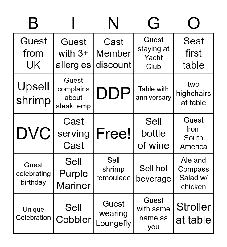 This bingo card has a free space and 24 words: Sell Purple Mariner, Sell Cobbler, DDP, Unique Celebration, Seat first table, Guest from UK, Upsell shrimp, Guest with 3+ allergies, Sell bottle of wine, Sell shrimp remoulade, Table with anniversary, DVC, Sell hot beverage, Ale and Compass Salad w/ chicken, Guest complains about steak temp, Guest with same name as you, Guest from South America, Cast Member discount, two highchairs at table, Cast serving Cast, Stroller at table, Guest celebrating birthday, Guest staying at Yacht Club and Guest wearing Loungefly.