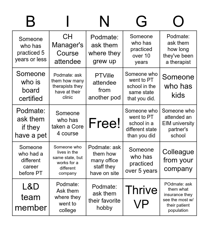This bingo card has a free space and 24 words: Someone who lives in the same state, but works for a different company, Podmate: Ask them where they went to college, PTVille attendee from another pod, L&D team member, Podmate: ask them how long they've been a therapist, Someone who has practiced 5 years or less, Someone who is board certified, CH Manager's Course attendee, Someone who went to PT school in a different state than you did, Podmate: ask them how many office staff they have on site, Someone who went to PT school in the same state that you did., Podmate: ask them if they have a pet, Someone who has practiced over 5 years, Colleague from your company, Podmate: ask them how many therapists they have at their clinic, Thrive VP, Someone who attended an EIM university partner's school, Podmate: ask them where they grew up, Someone who has kids, Someone who has taken a Core 4 course, POdmate: ask them what insurance they see the most w/ their patient population, Someone who had a different career before PT, Someone who has practiced over 10 years and Podmate: ask them their favorite hobby.