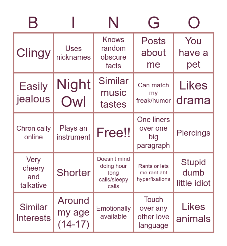 This bingo card has a free space and 24 words: Shorter, Around my age (14-17), Similar music tastes, Similar Interests, You have a pet, Clingy, Easily jealous, Uses nicknames, One liners over one big paragraph, Doesn't mind doing hour long calls/sleepy calls, Can match my freak/humor, Chronically online, Rants or lets me rant abt hyperfixations, Stupid dumb little idiot, Night Owl, Touch over any other love language, Piercings, Knows random obscure facts, Likes drama, Plays an instrument, Likes animals, Very cheery and talkative, Posts about me and Emotionally available.