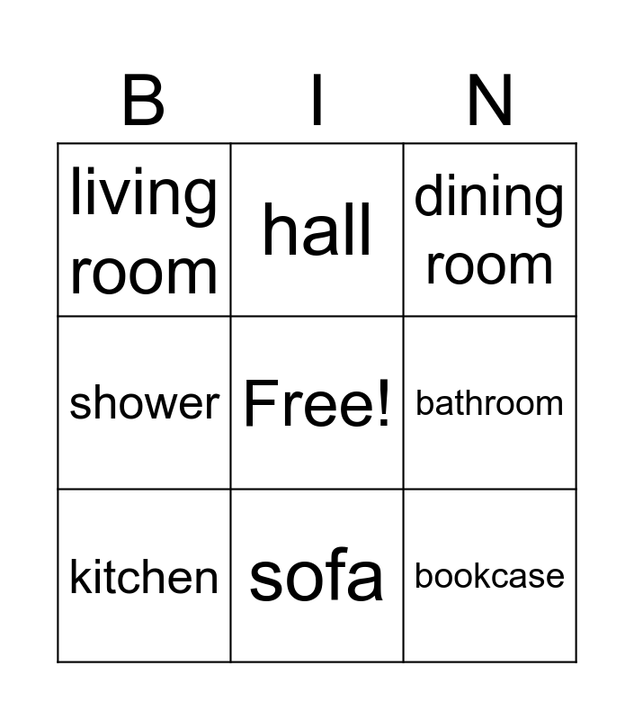 This bingo card has a free space and 8 words: bathroom, dining room, hall, kitchen, living room, bookcase, shower and sofa.