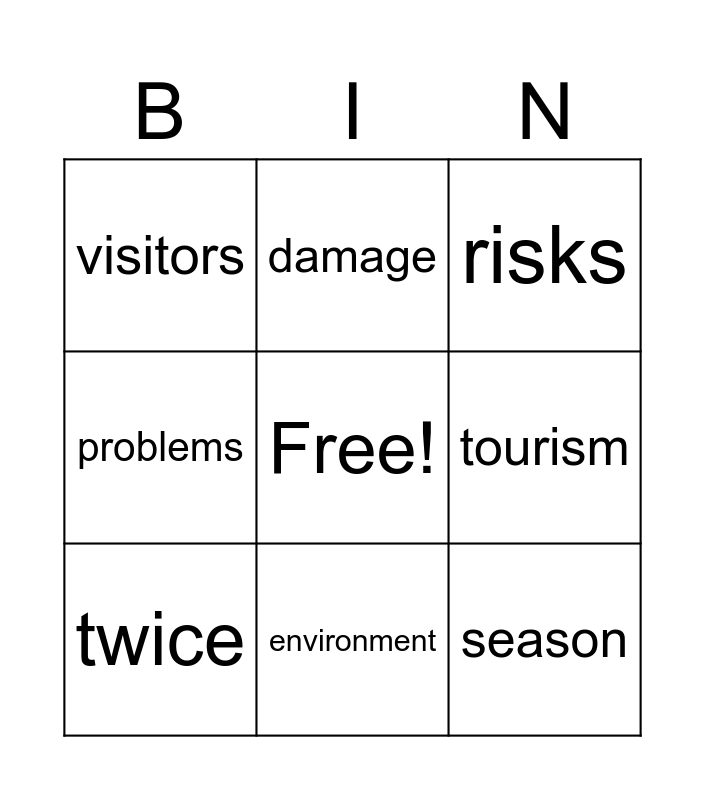 This bingo card has a free space and 18 words: disaster, a huge/negative impact, risks, visitors, money, problems, jobs, damage, environment, a goal, a living, season, a lot of harm, tourism, twice, a huge impact, warming and with.