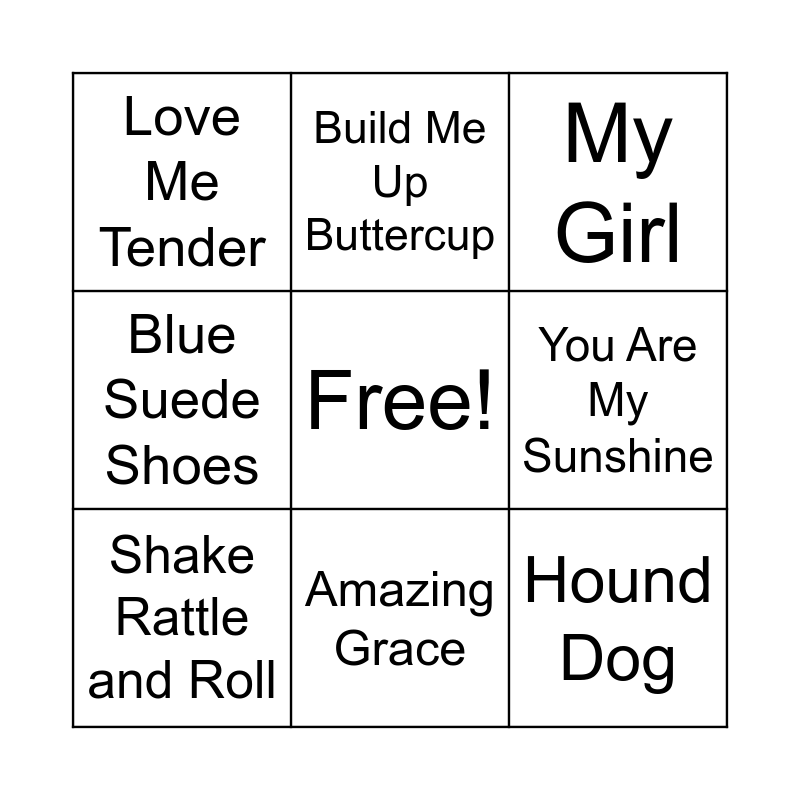 This bingo card has a free space and 8 words: You Are My Sunshine, My Girl, Build Me Up Buttercup, Shake Rattle and Roll, Love Me Tender, Hound Dog, Blue Suede Shoes and Amazing Grace.